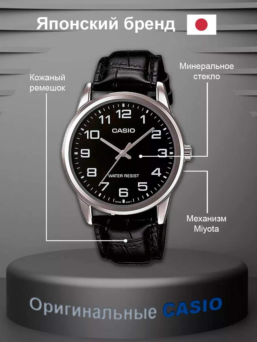 Мужские наручные часы Casio MTP-V001L кварцевые (возможно потребуется замена элемента питания). Корпус стальной с чёрным циферблатом и минеральным стеклом, которое не расколется от легкого удара, браслет кожаный. Модель Casio MTP-V001L обладает степенью влагостойкости 30 м (3 АТМ), где возможно мыть руки и пройти под легким дождем. В поставке отсуствует коробка, часы оригинальные.