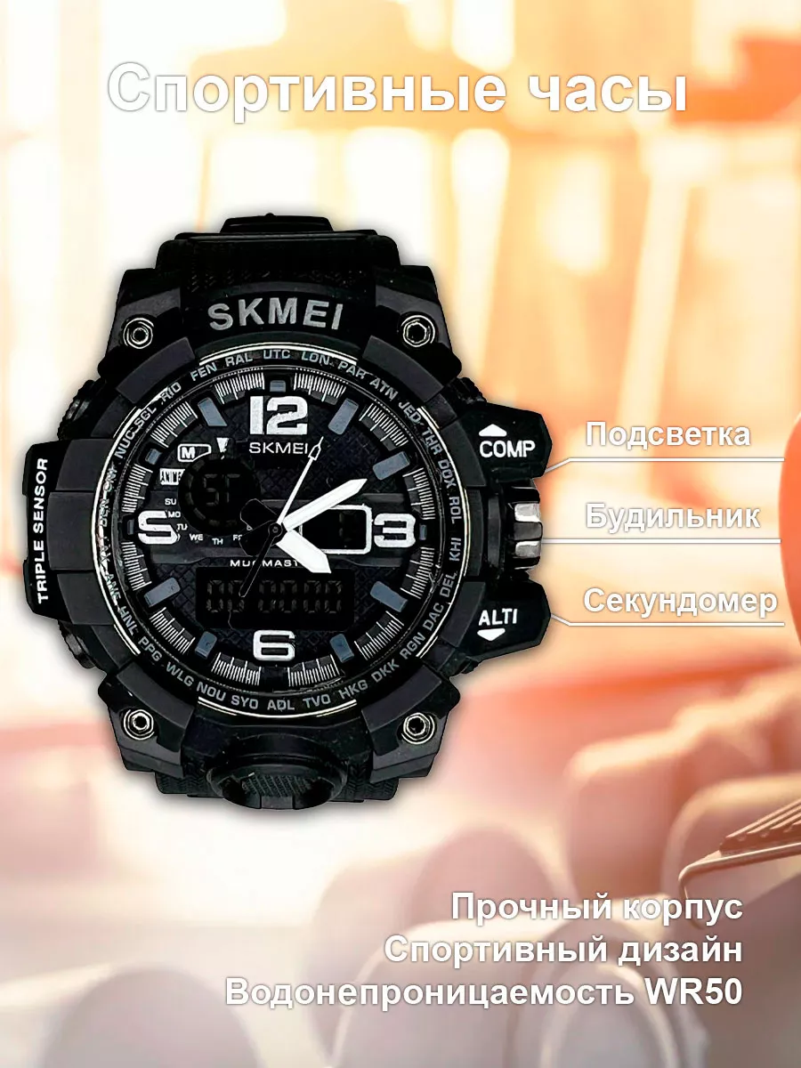 Мужские наручные многофункциональные часы SKMEI (аналог Casio G-Shock) фабричного производства. Часы полностью выполнены из каучука. Два циферблата, аналоговый и электронный. В часах имеются функции число, месяц, день недели, LED-подсветка, секундомер и будильник. Часы поддерживают 12/24 часовой формат. Возможно потребуется замена элемента питания. [полное описание]