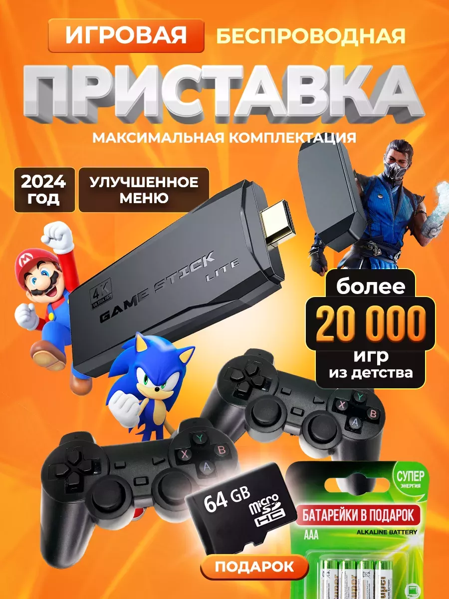 Игровая приставка ( консоль ) - это портативная приставка нового формата, включает в себя игры из самых популярных ретро консолей 9 различных приставок 8bit и 16bit и 32bit. Портативная приставка для ТВ максимально компактного размера, как стандартная USB - флешка. Приставка игровая на 64Gb поддерживает HD TV 4K формат и включает в себя 20037 игр от разных производителей . В беспроводная игровая приставка включены самые популярные игры из детства 90-х (включая игры на русском языке), в зависимости от модели приставки. Еще она поддерживает выход домашнего проектора и совместима со всеми современными телевизорами. Для подключения приставки требуется вход HDMI на телевизоре. Игровые джойстики беспроводные, легкие и удобные позволят погрузиться в процесс прохождения любимых игр, не вставая с дивана. Меню интуитивно понятное и с ним разберется даже ребенок. Игровая консоль приставка Game Stick lite - это отличный подарок и игрушка для детей, близких и любимых. Порадуйте себя, своего ребенка или мужчину. Игровая приставка, беспроводная консоль для детей и взрослых, которые хотят вспомнить детство, когда каждый ребёнок мечтал купить детскую приставку и играть в неё все выходные. Наша детская электроника содержит сразу 9 эмуляторов (MAME, FC, GB, GBA, GBC, MD, SFC, PS1, ATP с играми 8bit и 16bit).