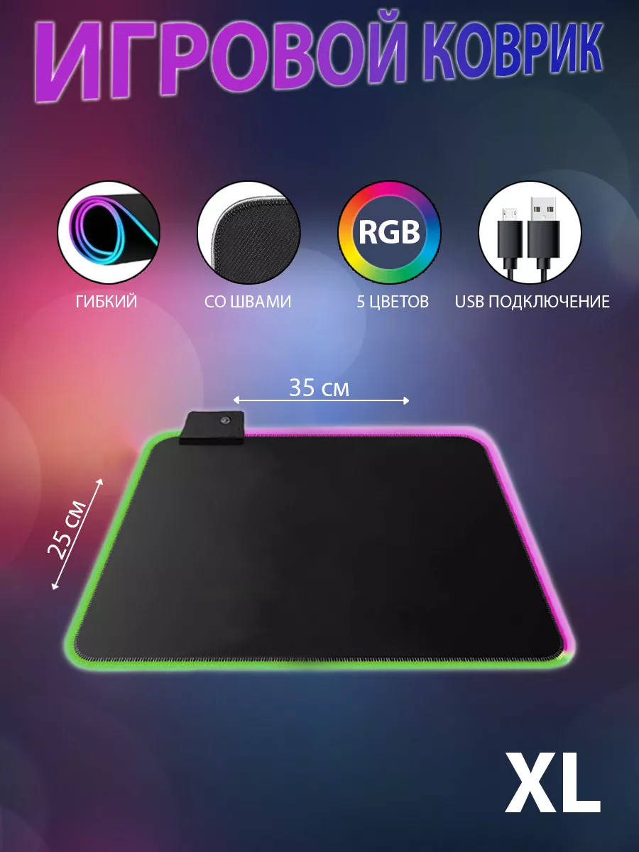 Коврик для мышки игровой с подсветкой RGB на стол - идеальное решение для всех геймеров и активных пользователей, которым требуется комфорт и высокая производительность. 5 цветов яркой неоновой подстветки, которые управляются простым нажатием кнопки. Насыщенные цвета подсветки RGB создадут атмосферу увлекательной игры, а размер в 350х250 мм обеспечит достаточное пространство для маневрирования и точных движений мышкой. Коврик XL имеет противоскользящую поверхность со швами по краям, которая гарантирует стабильное положение на столе даже при интенсивном использовании. Водонепроницаемый материал защитит ваш стол, если вы случайно прольете напитки или других жидкости. Так же его очень легко мыть. Интегрированная LED подсветка создает дополнительную атмосферу в игровой комнате. Благодаря уникальным технологиям и гибкости коврик легко складывается, что позволяет его удобно хранить или брать с собой на игровые мероприятия. Каучуковая основа прямоугольного коврика предотвращает скольжение. Но каучук обработан таким образом, чтобы не натирать руку при длительном использовании. Мягкая поверхность делает его приятным на ощупь. Коврик для мышки средний игровой с подсветкой RGB на стол - универсальный аксессуар. Воплотите ваши игровые амбиции с помощью коврика для мышки среднего размера с подсветкой RGB на стол. Технологически продвинутый и стильный аксессуар, который обеспечит вам комфортное и эффективное использование ваших игровых устройств. Товар приедет в красивой коробке, поэтому коврик станет отличным подарком геймеру. В комплекте также идет USB провод, что позволит комфортно подключить и резместить коврик на столе.