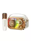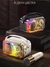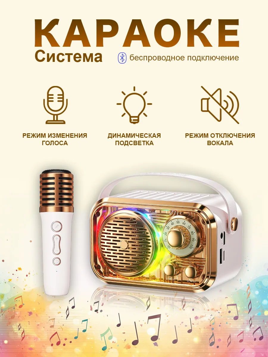 Идеальное решение для домашних развлечений и развития музыкальных способностей вашего ребенка - детская караоке система с беспроводным микрофоном и колонкой. Этот комплект станет отличным подарком для юного певца или певицы. Классчический дизайн делает возможным приобретение данной системы и для взрослой аудитории. Беспроводной микрофон в белом цвете с золотистой накладной: позволяет детям свободно передвигаться и танцевать, исполняя свои любимые песни без ограничений проводов. Высококачественная колонка: обеспечивает чистый и ясный звук с глубокими басами, что делает каждое выступление звездным. Обновленная технология BT 5,0, чип шумоподавления DSP и мощность колонки 6 Вт - четкий и чистый звук на профессиональном уровне. Простота использования: караоке система легко подключается к различным устройствам через Bluetooth, что позволяет использовать широкий спектр музыкальных треков, так же можно слушать свои любимые треки подключив карту памяти типа MicroCD или USB Флеш накопитель. Поддерживает мобильные телефоны, телевизоры, планшеты, компьютеры и другие устройства. Долговечность: компактная колонка с микрофоном выполнена из прочных материалов, способных выдержать активное использование детьми. Регулировка звука: возможность приглушить слова в музыке, использовать функцию "эхо" или разные голоса, чтобы создать оптимальный баланс звучания. Красочные световые эффекты: 5 видов световых эффектов создают вокруг атмосферу праздника, так же подсветку можно отключить. Преимущества: Удобство для родителей: благодаря беспроводным микрофоном нет необходимости разбираться с лишними проводами. Развитие таланта: пение помогает развивать у детей чувство ритма, уверенность в себе и артистические способности. Интерактивность: система может быть использована для устройства мини концертов на домашних вечеринках или семейных посиделках. Портативность: легкий вес колонки позволяет легко переносить систему из комнаты в комнату или даже брать её с собой в поездки.