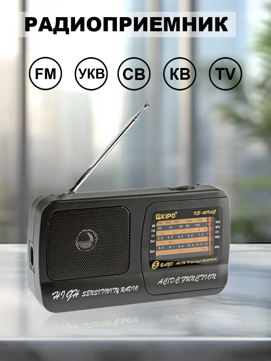 Компактный всеволновый простой радиоприёмник KIPO KB-409AC в сдержанной цветовой гамме и в классическом стиле передает качественный и четкий звук. Радиоприемник Kipo мощностью 2 Вт, имеет внутреннюю магнитную антенну средних волн и телескопическую для диапазонов FM и SW, может работать от обычной розетки 220 В или от 2-х элементов питания R20 (п... [полное описание]